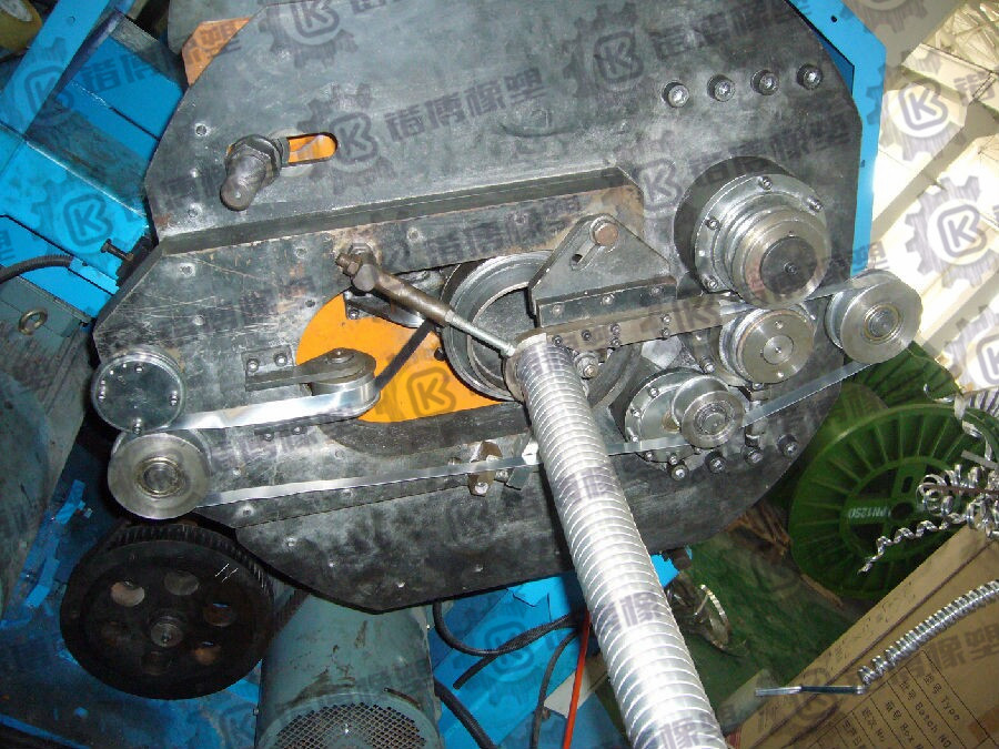 4.2.4?鎧裝主機(jī)成型系統(tǒng)在主軸出線端,由一臺(tái)15KW變頻電機(jī)帶動(dòng)一臺(tái)法國進(jìn)口設(shè)備行星齒輪差速變速器,通過同步帶帶動(dòng)裝在主軸上的行星齒輪及同步帶系統(tǒng),從而帶動(dòng)成形壓輪旋轉(zhuǎn)。放帶盤將帶材放出后經(jīng)過導(dǎo)輪由主軸中心孔進(jìn)入主軸出線端的鎧裝成型系統(tǒng),通過成形壓輪壓成形,經(jīng)過導(dǎo)帶裝置進(jìn)入一個(gè)螺旋狀的導(dǎo)向彎鉤,主機(jī)每轉(zhuǎn)一圈。成形的帶材繞在電纜上實(shí)現(xiàn)一個(gè)節(jié)距,通過主機(jī)的旋轉(zhuǎn)實(shí)現(xiàn)電纜的鎧裝。鋁帶成管鎧裝時(shí)的旋轉(zhuǎn)升角: