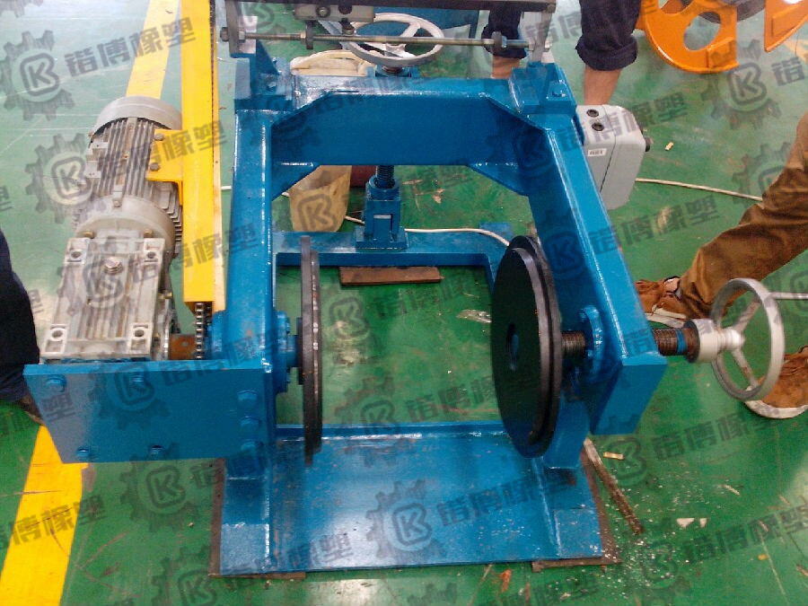 4.3.1?整機(jī)主框架為鋼板和型材焊接而成,通過一個(gè)伺服電機(jī)直聯(lián)蝸桿減速機(jī)帶動(dòng)一對(duì)嚙合齒輪,以保證上下牽引輪同步轉(zhuǎn)動(dòng),每個(gè)牽引輪各帶動(dòng)一條平皮帶傳動(dòng)。上下有五對(duì)氣缸驅(qū)動(dòng)壓緊裝置滾輪,使平皮帶壓緊電纜。平皮帶間距隨電纜直徑的不同而隨時(shí)變動(dòng),對(duì)于任何外徑的電纜,其中心高度不變。由氣動(dòng)系統(tǒng)均勻的調(diào)整夾緊壓力和控制上下氣缸的氣源。有一單獨(dú)氣缸用來調(diào)節(jié)上下平皮帶張緊力。牽引裝置兩端均有井式導(dǎo)線裝置,以保證電纜中心位置不變。帶電子計(jì)米。